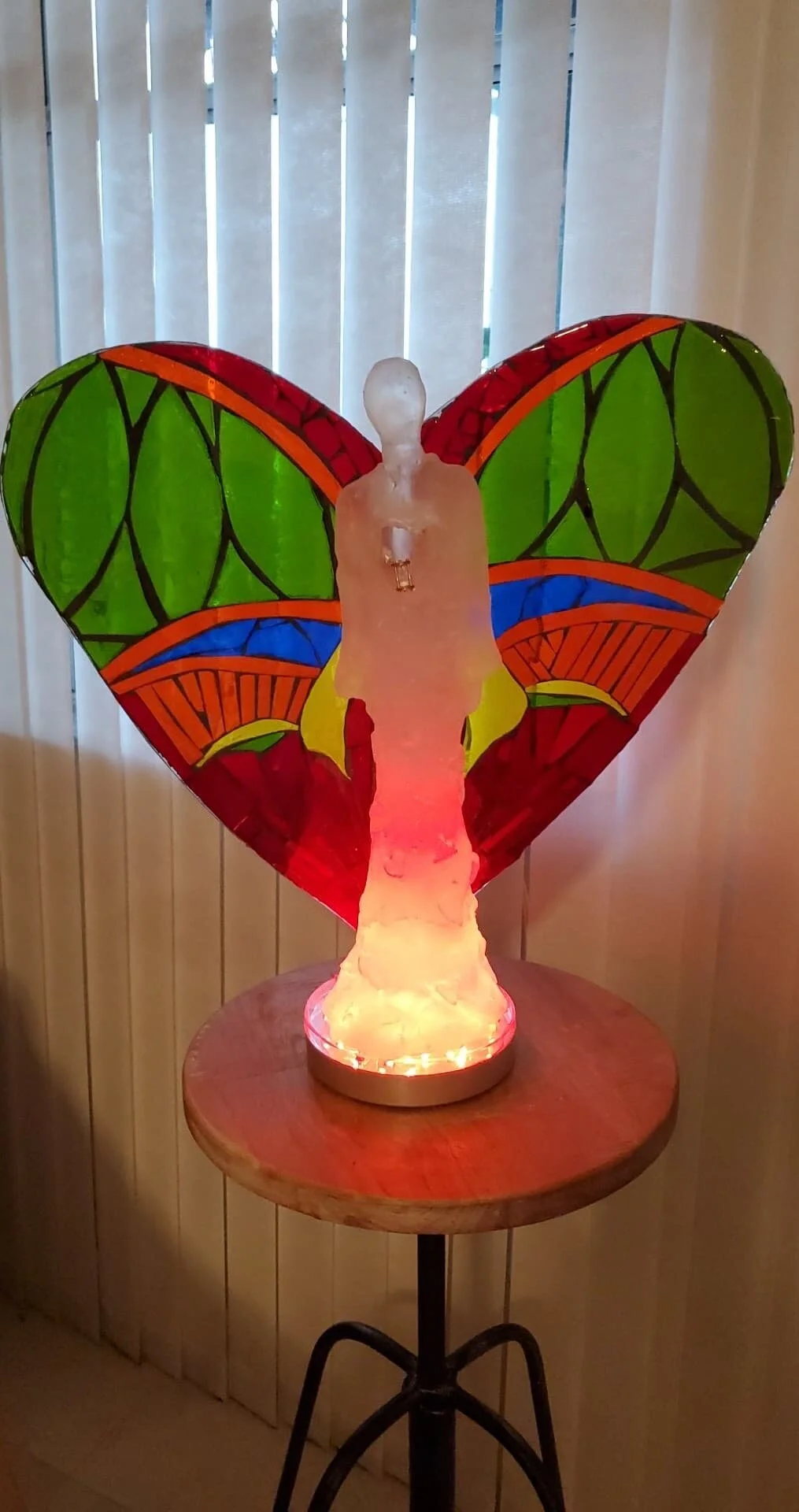 My angel was the Angel’s broken and empty heart!!!! and in place of his hart was an hourglass symbolic of specific time each person needs to heal. My wings ware a creation using all stain glass mosaic style symbolizing a sun rise, which for me indicates a new day to keep healing.